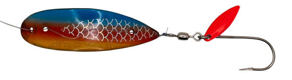 Designed for trolling, the dodging and weaving action of an Apex® creates strong vibrations in the water. Often, the erratic vibrations made by a wounded bait fish are the most enticing. The Apex® Lure duplicates these movements. Its contoured scoop front surface causes a rapid, side-to-side shaking action as it is trolled. The Apex will also dart violently from side to side and will spin from time to time.